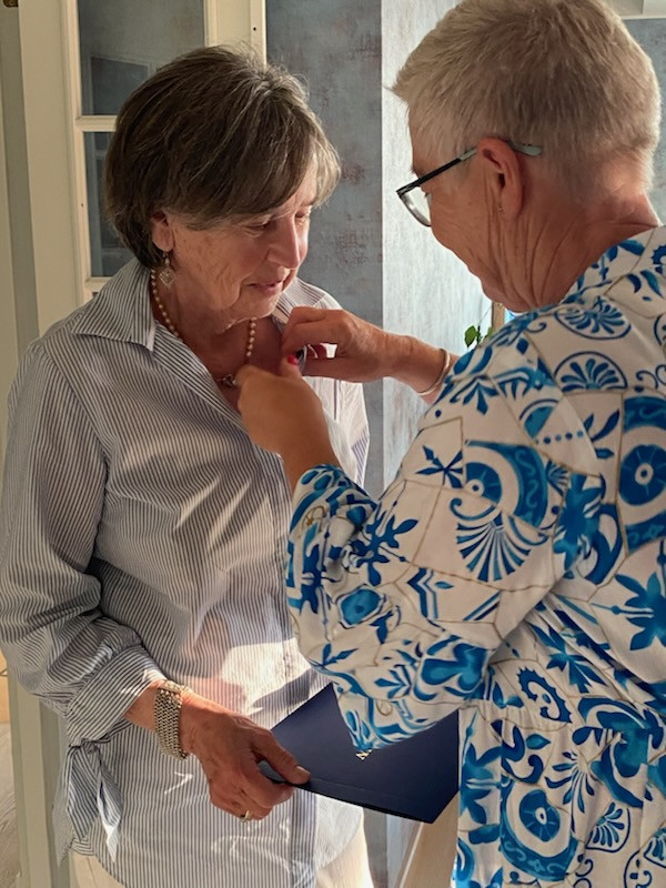 President Marianne overrekker Pauls Harris Fellow til Mai Torhild, og fester knappen på kjolen.